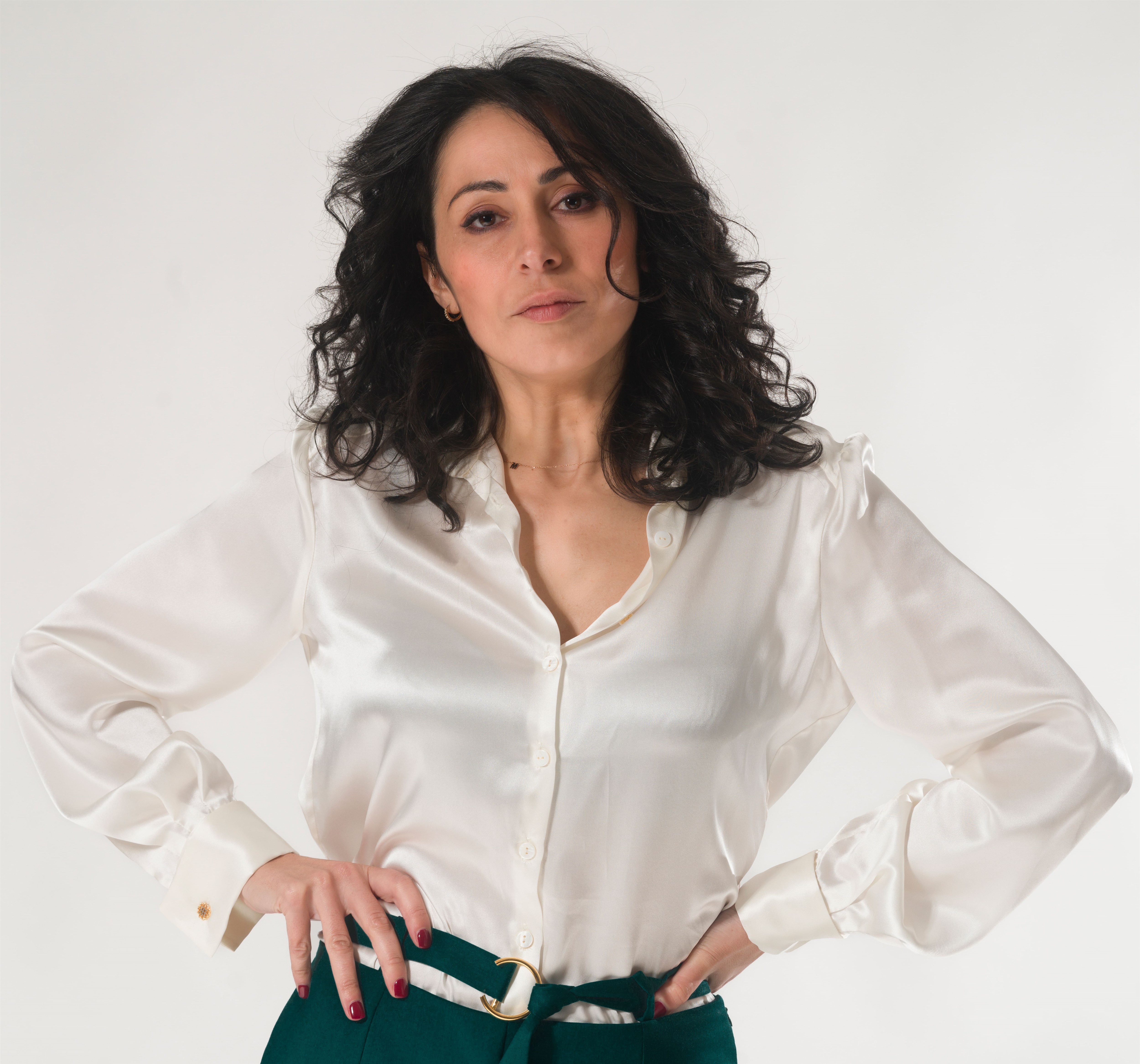 La sua linea è morbida grazie anche al soffietto sul retro, la pura seta accompagna le forme, come una carezza sulla pelle, Le maniche sblusanti e leggermente arricciate sulla spalla donano quel tocco bon-ton che Jessica ama tanto, mentre i polsini uniti con i gemelli gioiello hanno quel tratto maschile, tipico dello stile androgino di Marina.