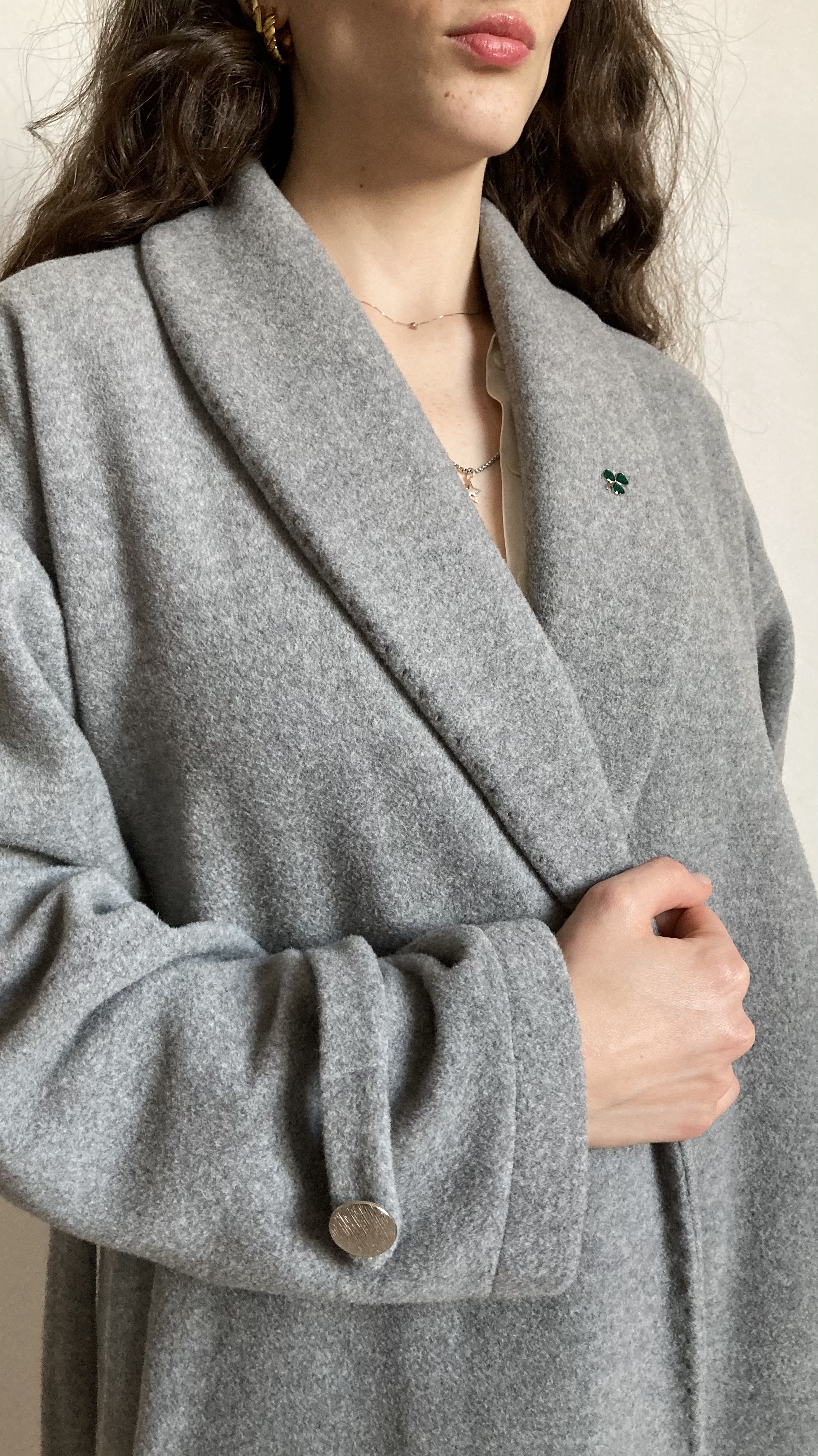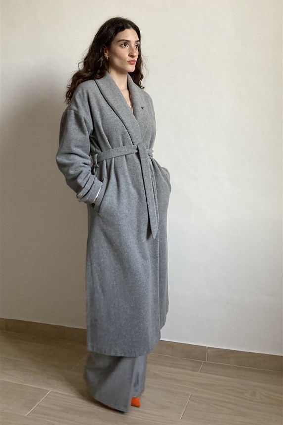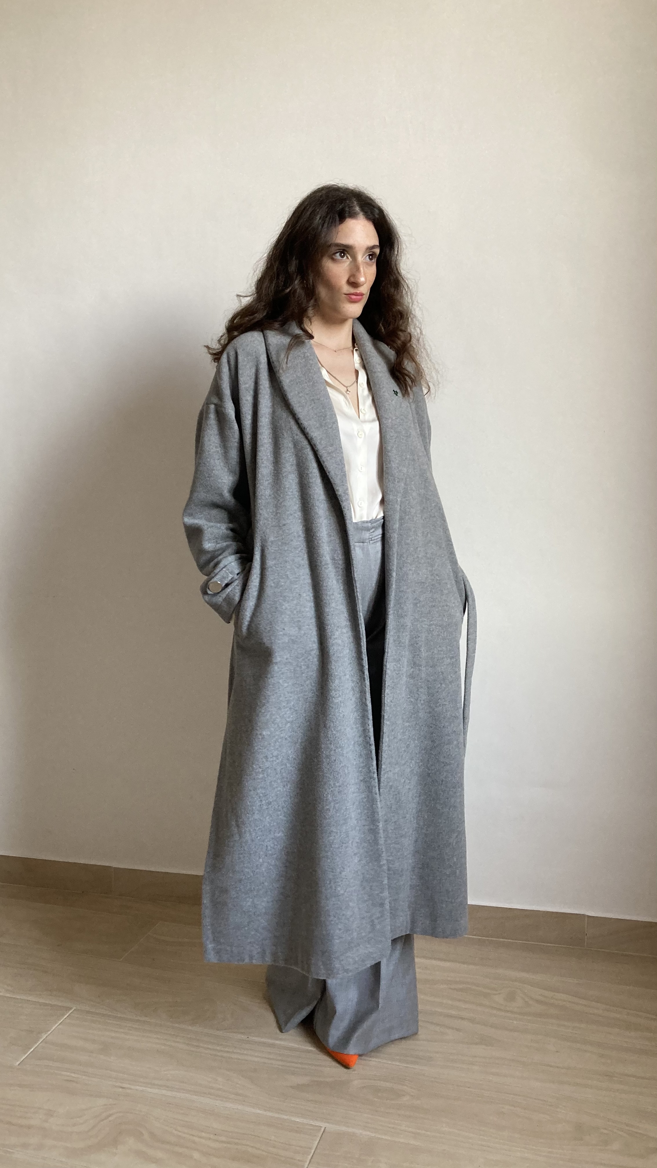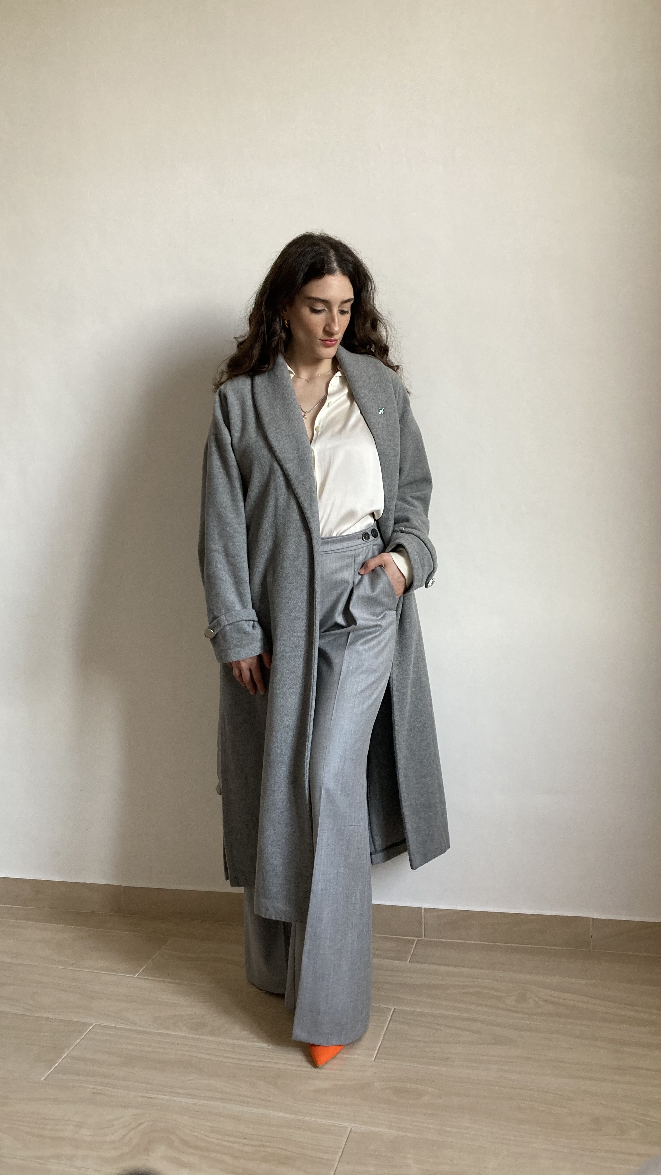 Il collo è sciallato per conferire eleganza , con particolare attenzione al dettaglio sulla manica, la martingala con bottone martellato silver nella versione grigio melange, oro in quella cipria .